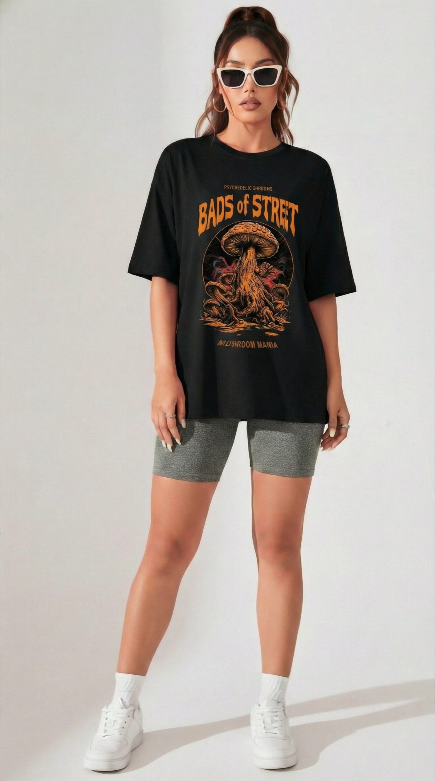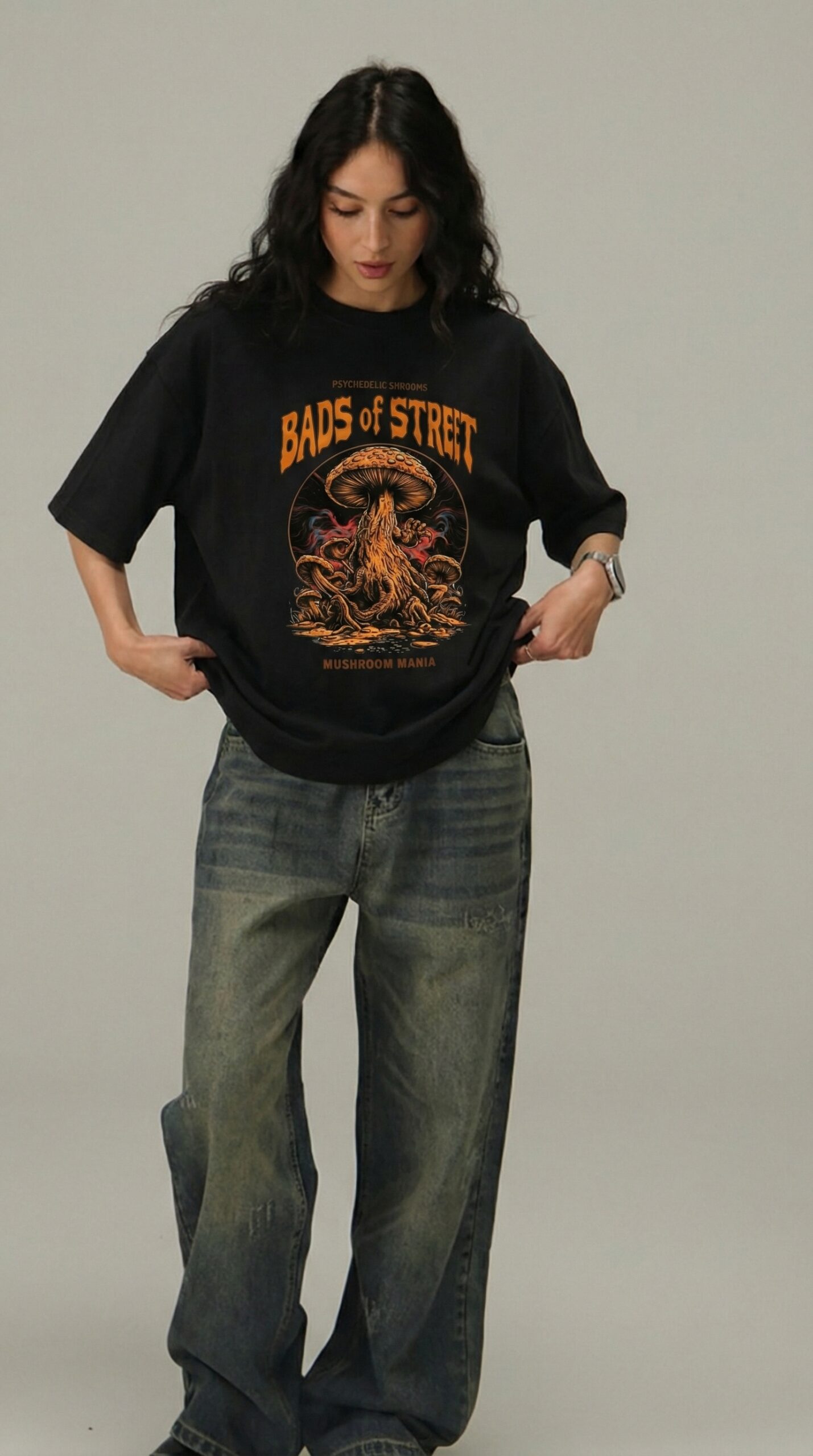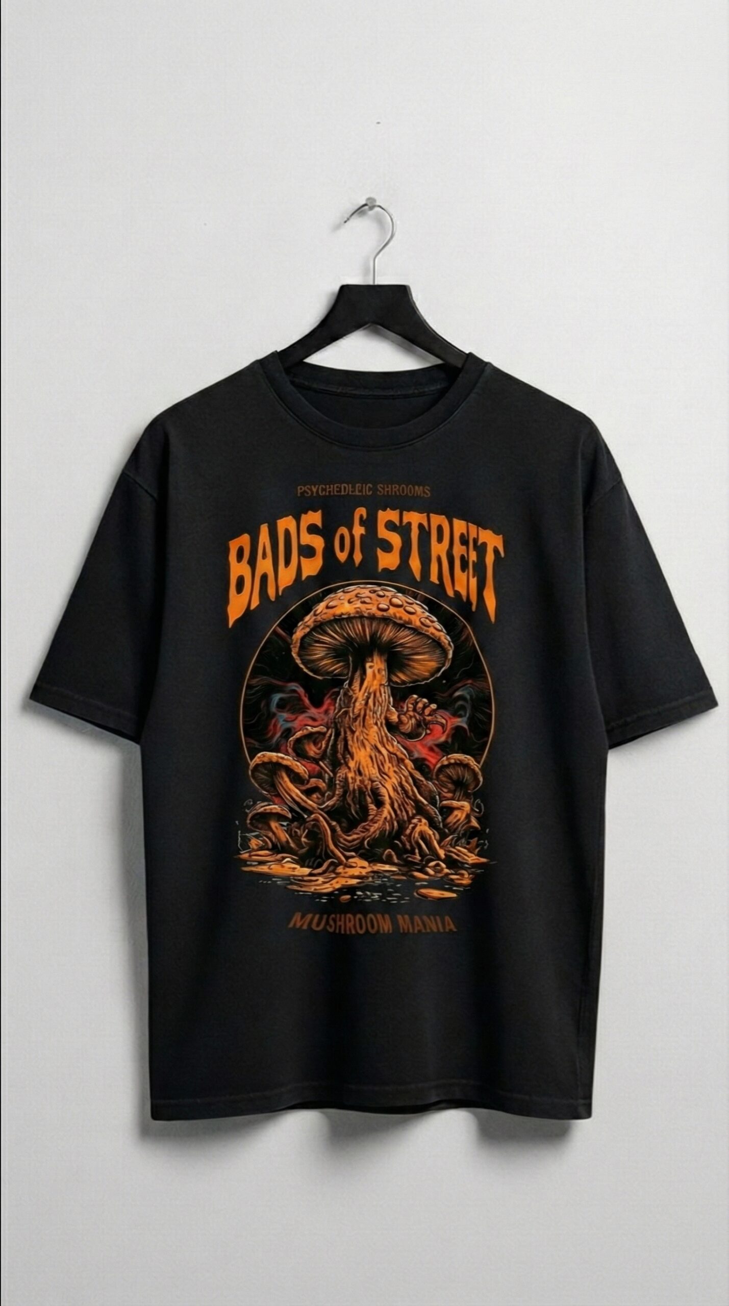 Make a bold statement with the Black “Mushroom Mania” Graphic T-Shirt from Bads of Street. Featuring a striking psychedelic mushroom design with fiery tones and intricate detailing, this tee captures raw underground energy. The clean black base enhances the artwork, creating a powerful visual contrast. Crafted from soft, breathable fabric for all-day comfort and effortless style. Perfect for pairing with cargos, denim, or layered street-inspired outfits. More than just a T-shirt — it’s a fearless expression of attitude and individuality.